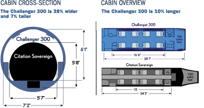 The Challenger 300 is 28% wider, 7% taller and 10% longer than the